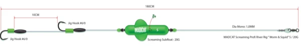 Deze kant-en-klare onderlijn is speciaal ontworpen voor het vissen op meerval in een stromende rivier. De ‘screaming’ float zorgt in een stromende rivier voor veel extra attractie waarmee je zelfs de meest passieve vissen tot een aanbeet kunt verleiden. De 1mm dikke monolijn en de oersterke haken zorgen ervoor dat je zonder problemen de grootste vissen kunt landen!