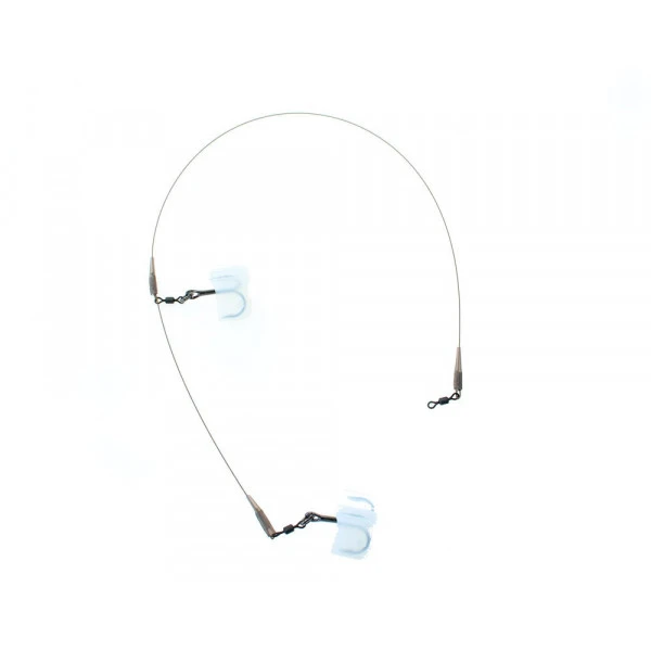 Schitterende kant-en-klare takels voor de doodaas-visserij. Deze takels bezitten twee VMC 9650 dreggen in maat 2. Deze dreggen zijn bevestigd aan een spliting die weer aan een wartel vast is gemaakt. Deze wartel is op de Ultra Thin Wire bevestigd. Op deze manier draait de dreg 360 graden ten opzichte van het staaldraad, waardoor je lijn minder snel kinken. Beide dreggen zitten vast bevestigd aan het staaldraad en schuiven dus niet! Hierdoor zal jouw aasvis zich niet “krommen” wanneer je hem binnen draait of uit werpt. De takels zijn met sleeves uitgerust en over deze sleeves zitten mooie, zachte beschermrubbers die de montage goed afwerken. Glad en sterk!